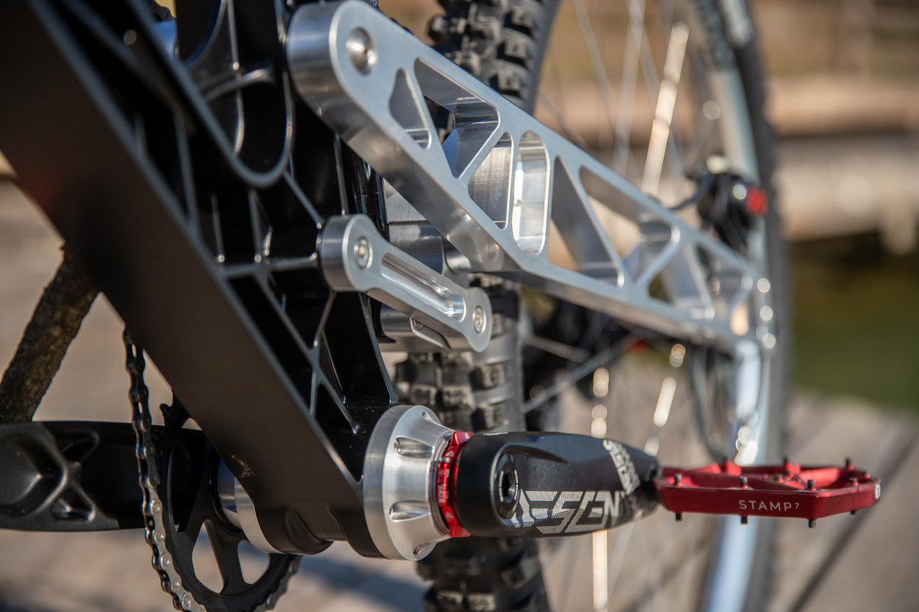 - Okvir: Aluminij 7075 T6, širina zadnjega pesta 150 mm, 210 mm hoda